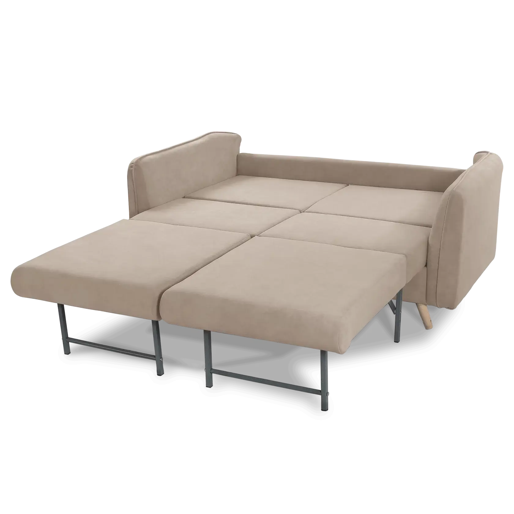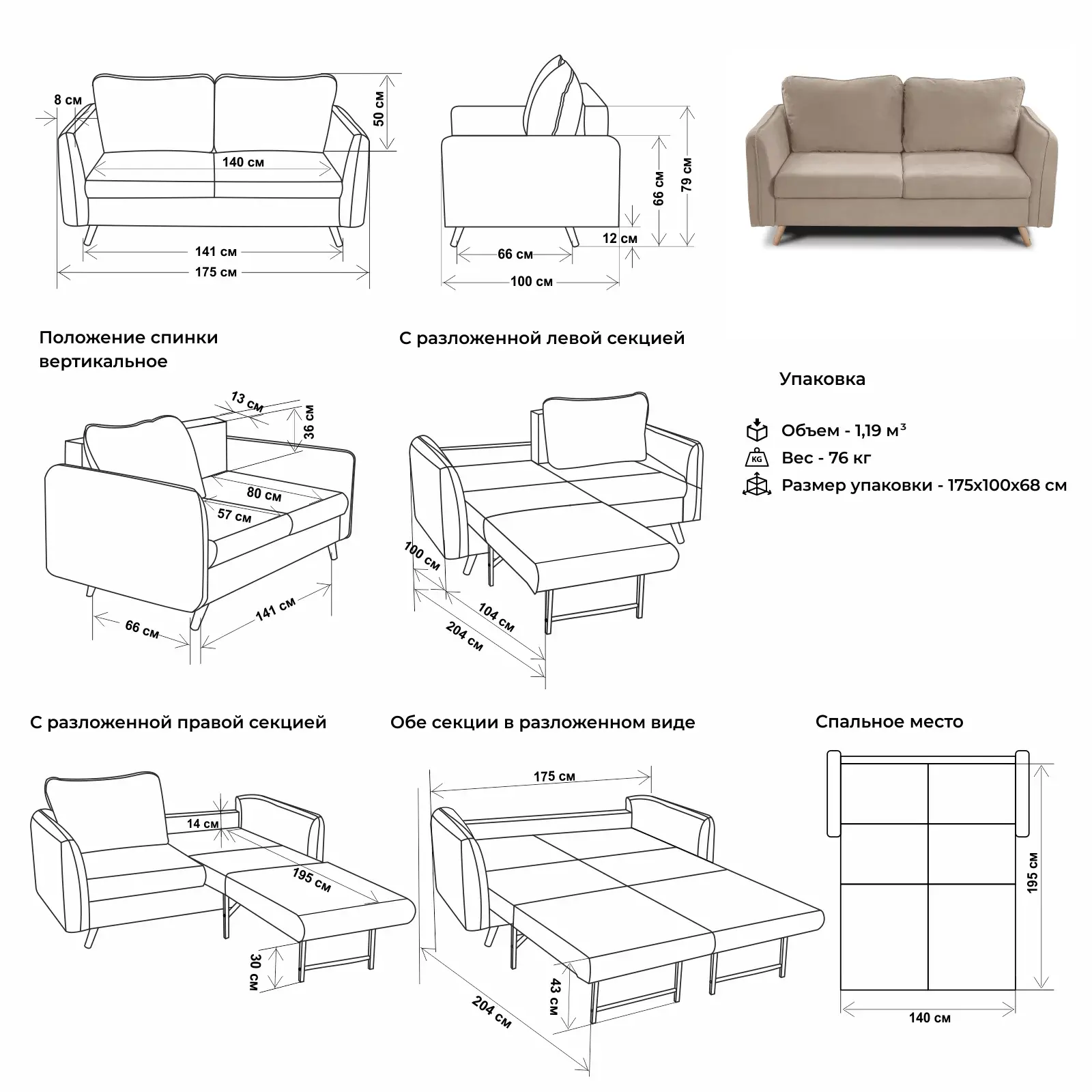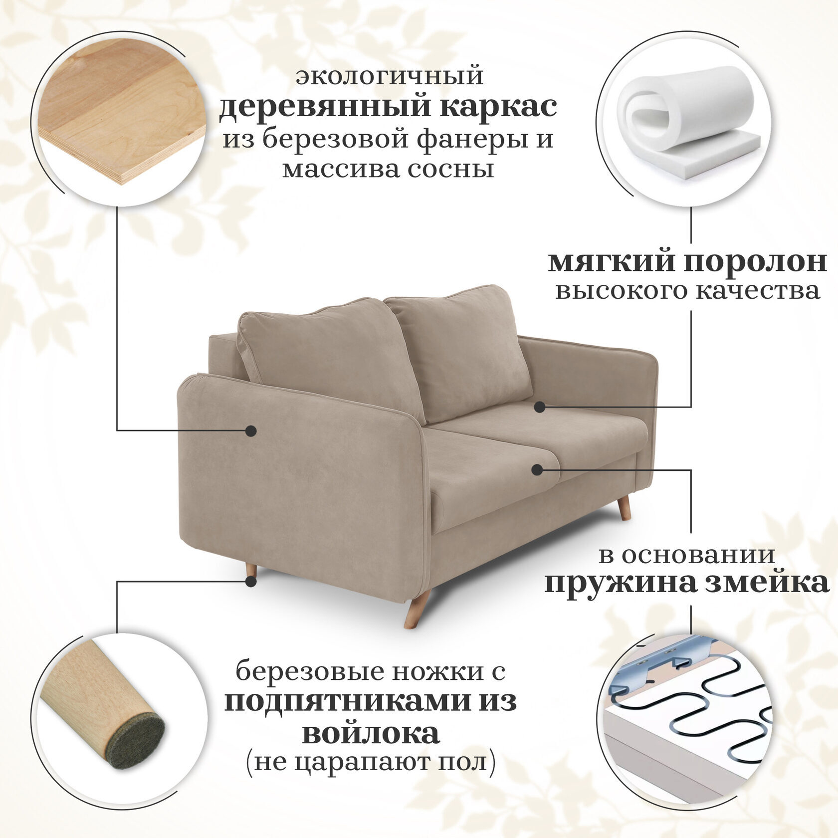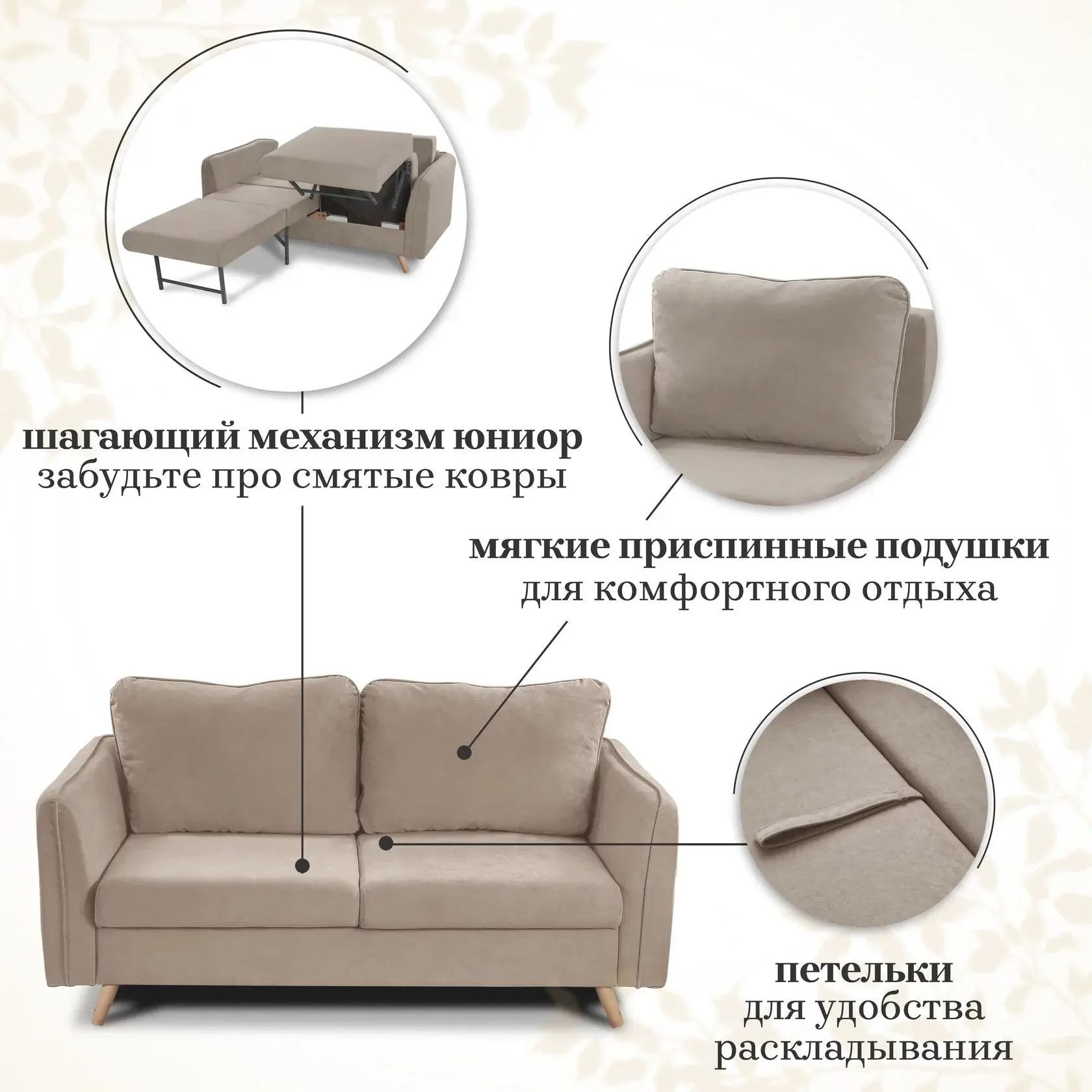 При своих компактных размерах диван очень вместительный. Он раскладывается в ровную монолитную поверхность для здорового сна, стыки между секциями не ощущаются. Для вашего удобства предусмотрены петли для раскладывания дивана. Узкие подлокотники зрительно подчёркивают его элегантность и экономят пространство. Высокие деревянные ножки с подпятниками из войлока обеспечивают защиту напольного покрытия и удобство для уборки роботу-пылесосу.