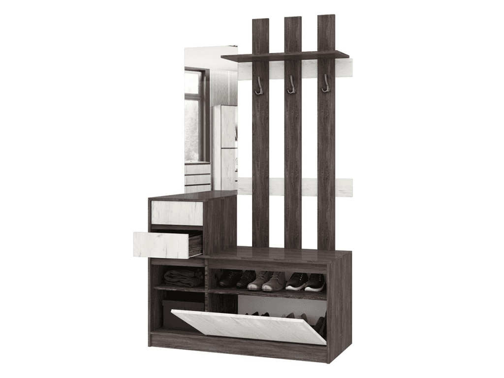 Прихожая «Милана» — это модульная прихожая, которая состоит из панели под вешалки, пенала с полками и вешалкой и тумбы для обуви.