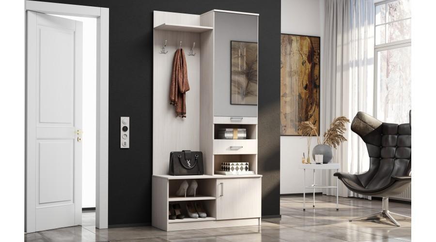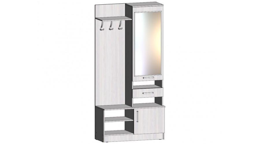 Прихожая «Ривьера» — это стильная и функциональная прихожая, которая подойдёт для любого интерьера. Она оснащена открытой вешалкой с прочными крючками для верхней одежды и зонтов, распашной дверцей с зеркалом, выдвижным ящиком на роликовых направляющих и вместительными нишами для хранения обуви.