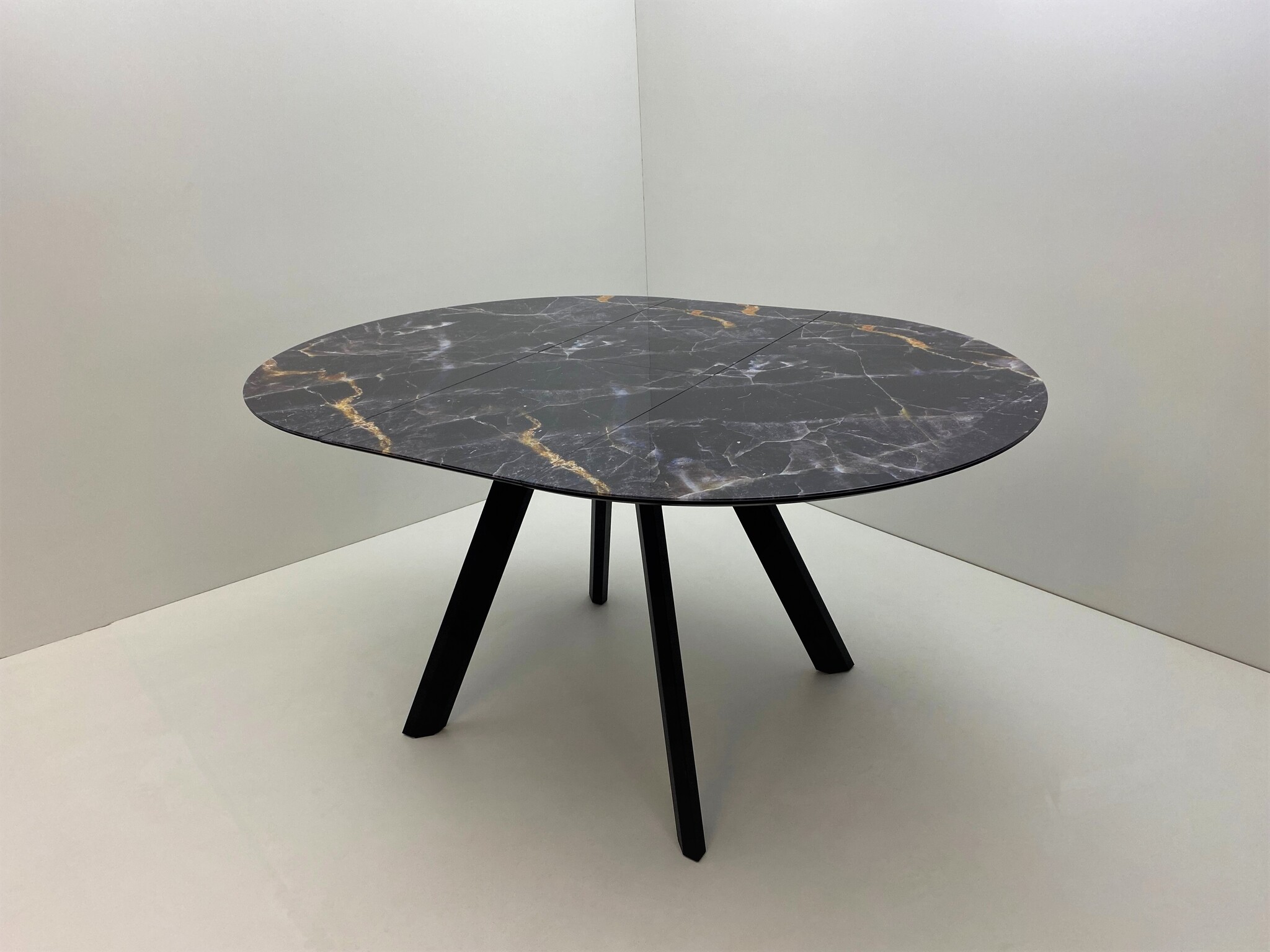 Раздвижной круглый стол. Столешница выполнена из ЛМДФ с закаленным стеклом. Подстолье покрыто плёнкой ПВХ. Раскладка стекло с механизмом<бабочка>. Комплектуется металлической ножкой.