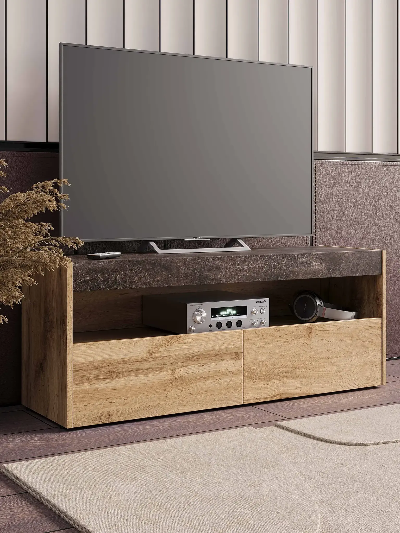 ТВ тумба Вегас Дуб Вотан/Ателье темн. Габариты 1120(Ш) х 343(Г) х 450(В) мм. Материал ЛДСП. Кромка ПВХ. Направляющие полного выдвижения. Универсальная сборка на любую сторону. Надежная упаковка Количество упаковок в изделии: 1 шт.