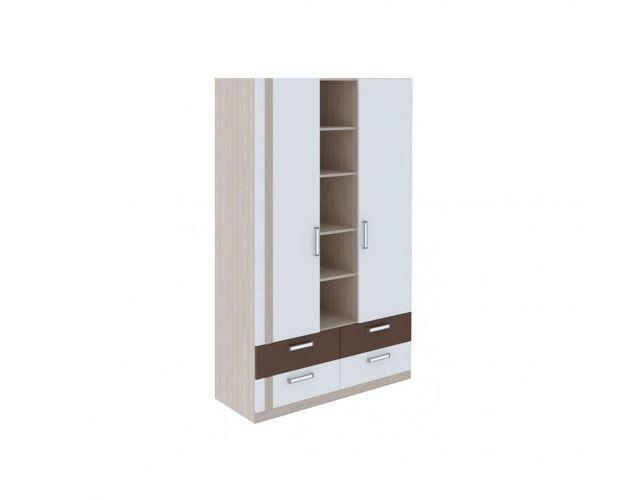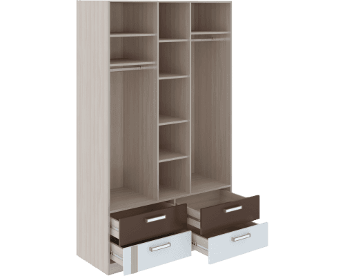 - Шкаф имеет два отделения со штангами для вещей на вешалках и полками над ними + 4 выдвижных ящика по 2 с каждой стороны.